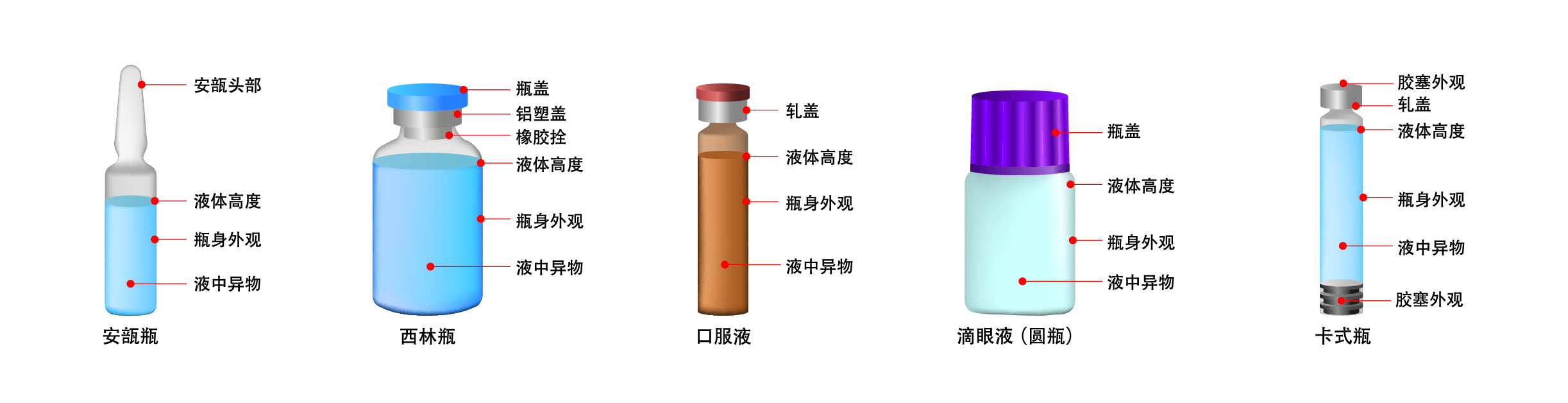 安瓿瓶注射剂,西林瓶(液剂、冻干剂),口服液,滴眼液,卡式瓶注射剂,预充针注射剂、大输液。