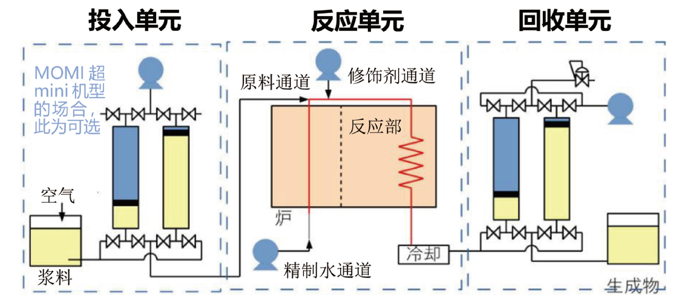 通过流通方式进行超临界水处理的装置。 超临界水指的是:在温度374°c,压力22.lMPa以上状态的水兼具液体和 气体特质的状态。本装置为流通式,连续进行原料处理,比起批量式节约时间。粒子送液·回收通过气缸系统。